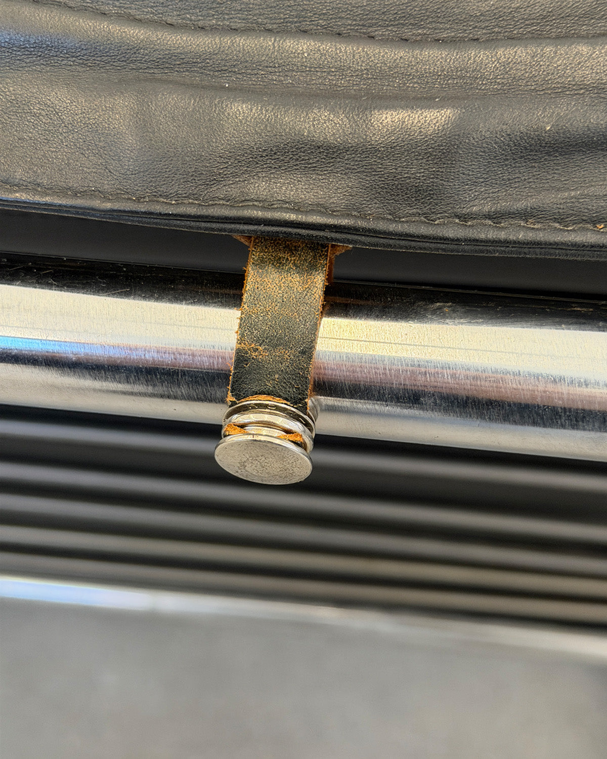 The piece displays visible patina throughout, with creasing and wear to the black leather that speaks to decades of use. Despite this, both the leather upholstery and support straps remain intact, with only one small tear in the leather. The result is a sofa that retains full functionality while offering a striking surface character—making it a unique example where time has enriched rather than diminished its appeal.