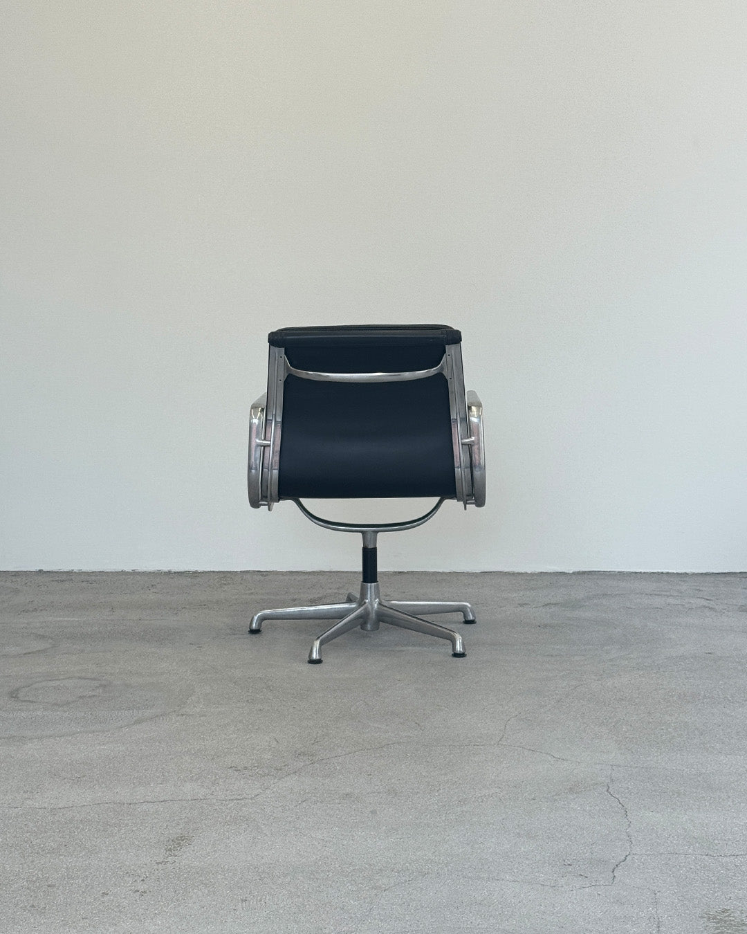 A refined member of the Soft Pad Group, originally designed in 1969 by Charles & Ray Eames and produced by ICF Italy for enduring comfort and elegance. Featuring a medium-high backrest with three sewn-on polyurethane-foam cushions in supple black leather, all set within a slim die-cast aluminum profile with a four-star swivel base — in good vintage condition with sign of wear and aging. This piece was produced in the 1990s.