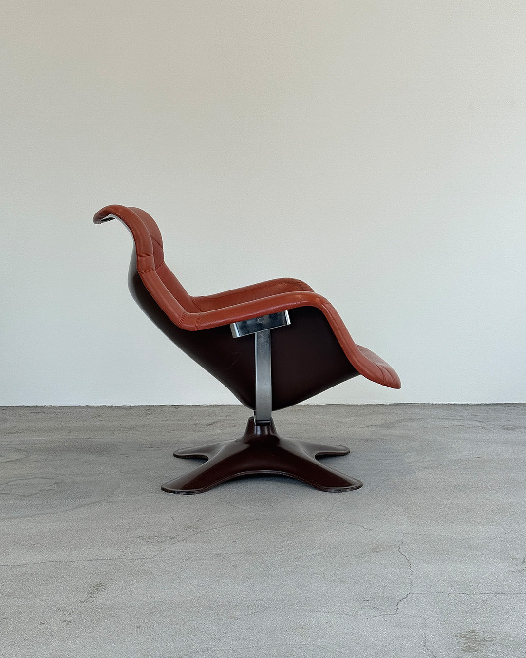 The Karuselli Lounge Chair, designed by Yrjö Kukkapuro in the 1960s, is a true icon of timeless design. This piece features luxurious, patinated Terracotta leather upholstery, combined with a rare brown base, making this chair especially unique.